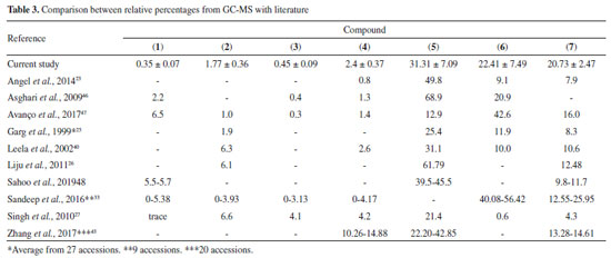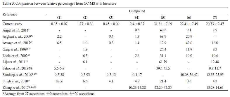 Analyses of the samples were performed by peak area normalisation. Table 2 shows the average, standard deviation and the relative standard deviation (RSD%) values of the relative proportion area % (RPA). Table 3 shows the results of the comparison between the relative percentages of C. longa essential oil obtained in this study and those reported in the literature using MS. This comparison revealed that the major compounds reported in the literature were similar to those observed in the present study.