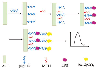 The selectivity of the biosensor could be enhanced by utilizating the peptide for twice to capture the LPS. When Ru1@SiO2-peptide nanoprobes was bound to the LPS/peptide/MCH/AuE, the expression of LPS could be evaluated by the ECL signal. This biosensor established could provide a way to evaluate the LPS expression on the bacteria surface, as well as open up new avenues to known the physiological functions of LPS in bacteria processes and the clinical analysis of LPS related diseases.