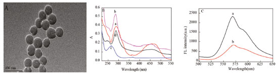 RESULTS AND DISCUSSION Characterization of ECL nanoprobe Figure 2A showed that the resultant Ru1@SiO2 were yellow and with an average diameter of about 50 nm. Figure 2B were the UV-visible spectra of Ru(bpy)32+, Ru1@SiO2, peptide and Ru1@SiO2-peptide. The absorption spectrums were much the same for the pure Ru(bpy)32+ (line a) and synthesized Ru1@SiO2 (line b), while two maximum absorption peaks at about 290 nm and 458 nm. A characteristic absorption peak at 257 nm was observed for peptide (line c). As can be seen, the Ru1@SiO2-peptide showed absorption peaks at 287 nm, 457 nm and 248 nm, respectively (line d). Compared with the 290 nm and 458 nm of Ru1@SiO2, 257 nm of the peptide, the blue shift occurred, indicating that the Ru1@SiO2-peptide synthesis was successful. The concentration of nanoprobe was estimated to be 6.5 × 10-6 mol L-1, according the UV-visible absorption of Ru(bpy)32+ at 458 nm.25 Figure 2C was the fluorescence spectra of the pure Ru(bpy)32+ and Ru1@SiO2-peptide. It showed that their maximal emission were at 568 nm and 570 nm, respectively, while the excitation at 458 nm, which also indicated the success of our nanoprobe preparation.