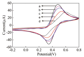 ![]() Figure 3. Cyclic voltammograms obtained at different electrodes in 0.05 mol L-1 [Fe(CN)6]3-/4 (0.10 mol L-1 PBS, pH=7.0) (A). AuE (a), peptide/AuE (b), peptide/MCH/AuE (c), LPS/peptide/MCH/AuE (d), Ru1@SiO2-peptide/LPS/peptide/MCH/AuE (e). LPS: 10 ng mL-1