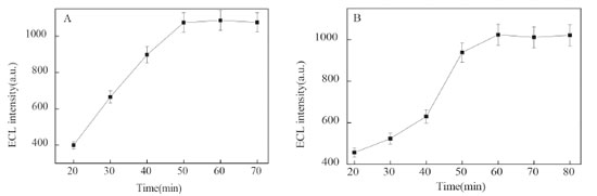 ![]() Figure 4. Effect of binding time between peptide and LPS (A), LPS and Ru1@SiO2-peptide (B) on the ECL intensity in 50 mmol L-1 TPA (0.1 mol L-1 PBS, pH = 7.0). LPS: 10 ng mL-1