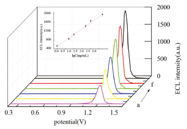 ![]() Figure 5. ECL intensity-potential curves with different concentrations of LPS at 100 mV s-1 in 50 mmol L-1 TPA (0.1 mol L-1 PBS, pH = 7.0). (a) 1.0 ng mL-1, (b) 5.0 ng mL-1, (c) 10 ng mL-1, (d) 50 ng mL-1, (e) 100 ng mL-1, (f) 500 ng mL-1. Inset: calibration curve for LPS