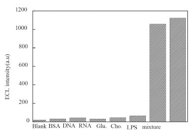 ![]() Figure 6. Selectivity of the ECL biosensor to 10 ng mL-1 LPS by comparing it to the interfering biological species, 5.0 µg mL-1 BSA, DNA, RNA, glucose and cholesterol