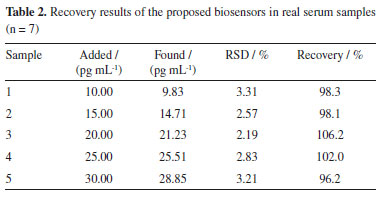 The application of the ECL biosensor was also investigated. The serum samples collected from Shangluo Hospital, China, and the real sample was prepared by spiking different concentrations of LPS into 50-fold-diluted serum samples with 0.01 mol L-1 pH 7.0 PBS. The LPS concentration in serum was estimated using the standard addition method by the proposed ECL biosensor. The experimental results were shown in Table 2. The RSD of each sample was less than 3.31% for five times parallel detections and the recovery varied from 96.2%~106.2%, which showed that the biosensor constructed can be used for the detection of LPS in real serum samples.