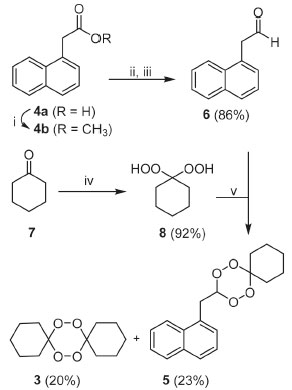 RESULTS AND DISCUSSION Synthesis of tetraoxane derivative of 2-(naphtalen-1-yl)acetic acid (5) The synthesis of tetraoxane 5 is outlined in Scheme 1. The required aldehyde 6 was obtained from the commercially available 2-(naphtalen-1-yl)acetic acid (4a). The initial attempt to convert 4a into 6 involved its quantitative transformation into the corresponding methyl ester 4b, followed by reduction with DIBAL. Despite some reports on the direct conversion of methyl esters into the corresponding aldehydes, in our hands the alcohol was obtained as the sole product.23 Based on this result, the acid 4a was treated with LiAlH4 and the alcohol formed was subsequently oxidized. Initial Swern oxidation resulted in total consumption of the alcohol, affording the required aldehyde in a consistent but poor yield (9%). Such low yield could be due to degradation of the aldehyde via initial aldol condensation in the presence of triethylamine in the reaction medium.24,25