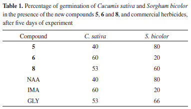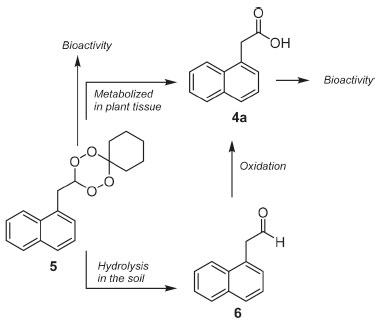 CONCLUSIONS In summary, we have developed a synthetic procedure to convert commercial NAA into a new tetraoxane 5. In a pre-emergency bioassay, the new tetraoxane is effective in inhibiting the growth of several important weeds. The compound seems to act via auxinic path and also as a photosystem inhibitor. Moreover, some synthetic precursors of 5 also have high phytotoxic activity, suggesting that if it is degraded it could provide other species that could continue acting as herbicides.