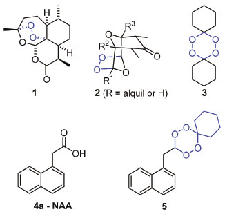 ![]() Figure 1. Structures of artemisinin (1), general formula of ozonides (2), tetraoxane (3), 2-(naphthalen-1-yl)acetic acid (NAA) (4a), and the new tetraoxane (5) designed by "Active compound Derivatization Method" (ADM)