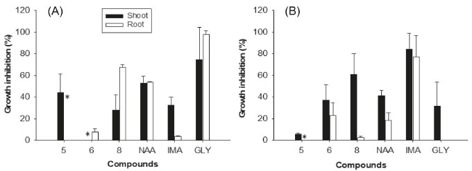 ![]() Figure 2. Effect of compounds 5, 6 and 8 on the growth inhibition of shoot and roots of Cucumis sativa (A), and Sorghum bicolor (B). Values were calculated based on the dry weight of the control. Commercial herbicides used as positive control were: 2-(naphthalen-1-yl)acetic acid (NAA), imazethapyr (IMA), glyphosate (GLY). The compounds were tested at 0.125 mmol L-1. The presence of an asterisk (*) instead a bar indicates stimulation (see Tables 2S-7S for full data)