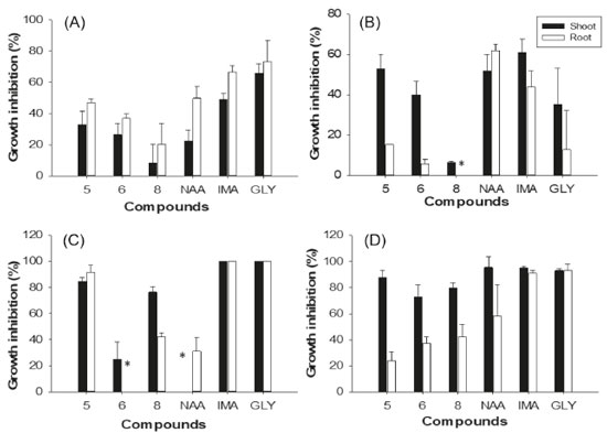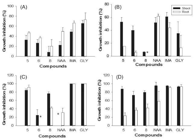![]() Figure 3. Effect of compounds 5, 6 and 8 on the growth inhibition of shoot and roots of Bidens pilosa (A), Iponomea acuminate (B), Solanum americanum (C) and Altenanthera ficoidea (D). Values were calculated based on the dry weight of the control. Commercial herbicides used as positive control: 2-(naphthalen- 1-yl)acetic acid (NAA), imazethapyr (IMA) and glyphosate (GLY). The compounds were tested at 0.125 mmol L-1. The presence of an asterisk (*) instead a bar indicates stimulation (see Tables 2S-7S for full data)