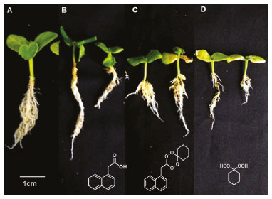 I. Departamento de Química, Universidade Federal de Minas Gerais, Campus Pampulha, 31270-901 Belo Horizonte - MG, Brasil Recebido em 12/02/2020 *e-mail: lcab@ufmg.br Modern agriculture relies on the massive use of agrochemicals, including herbicides. Despite their effectiveness, a continuous use of herbicides sharing the same target has resulted in the selection of weed biotypes resistant to such chemicals. To cope with this problem, the development of new herbicides is an urgent requirement. In this work we applied the Active compound Derivatization Method (ADM) strategy to develop a new tetraoxane (5), derived from the synthetic auxin 2-(naphtalen-1-yl)acetic acid (NAA). Greenhouse bioassays showed that 5 caused chlorosis, necrosis and leaf epinasty in Cucumis sativa. Furthermore, this compound, at the concentration of 1.25 x 10-5 mol L-1, inhibited the growth of important weeds such as Bidens pilosa, Iponomea acuminate, Solanum americanum and Althernantera ficoidea. For some weeds, the compound effect was higher or comparable to those caused by commercial glyphosate and imazethapyr. In addition, degradation studies revealed that 5 is transformed into NAA. The results also showed that 5 could act as photosynthesis inhibitor and as an auxin herbicide. In summary, we have discovered a new compound that may be a useful lead for the development of a commercial herbicide. INTRODUCTION Since the discovery of phytotoxic activity of phenoxyacetic acid derivatives in the 1940s, the use of synthetic organic herbicides became the most reliable and cost-effective strategy to control weeds in agricultural and non-agricultural areas.1 During the last decades some new commercial herbicides, with new modes of actions, have been developed.2,3 Despite such success, the repetitive and massive use of herbicides has led to the appearance of an increasing number of weeds resistant to one or more products.4,5 In order to overcome such problems, and cope with the increasing demand for food required for the continuously rising human population, the agrochemical industries and the academy must find new herbicides, focusing their efforts on finding compounds with new modes of action.6,7 In line with such global efforts, our research group has been using a diversity of natural products as a model for the development of new compounds endowed with phytotoxic activities (Figure 1).8-11 This strategy has been used by many authors, including the group led by Duke, that has demonstrated the ecologic interactions played by artemisinin (1), a natural product isolated from the plant Artemisia annua. They reported the phytotoxic activity of artemisinin against species such as Lactuca sativa and Raphanus sativa.12Artemisinin owes its biological activities largely to the peroxide bond in its structure. However, its commercial use as herbicide is hampered by the cost of large-scale production due to its complex structure.13 Inspired by such investigations, we have pioneered the discovery of a new class of herbicides candidates, of general structure 2, bearing a 1,2,4-trioxolane (ozonide) moiety. These compounds have a peroxide group similar to that found in the 1,2,4-trioxane artemisinin.14 Further investigations in our group resulted in the discovery that 1,2,4,5-tetraoxanes, as illustrated by 3, are potent herbicides against the weeds Euphorbia heterophilla and Brachiaria brizantha.15,16