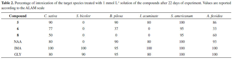 Having demonstrated that the hybrid peroxide 5 caused a significant inhibition on shoot formation in C. sativa and S. bicolor, we further investigated the activities of all compounds against the weeds Iponomea acuminate, Bidens pilosa, Solanum americanum and Alternanthera ficoidea (Figure 3). Those weeds are ubiquitous in crops plantations such as soybean, cotton, and tomatoes, all of them being cultivated in large areas in Brazil and corresponding to a high proportion of the national agricultural production.35-38 So, controlling such species is essential to guarantee a maximum profit from such crops.