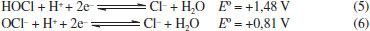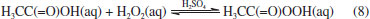 O radical OH é a mais reativa espécie de oxigênio, com uma meia vida de 1 ns em sistemas biológicos. Por ser pouco seletivo, reage com diferentes biomoléculas com constantes de velocidade na ordem de 109 a 1010 mol-1 L s-1.91 Essa baixa seletividade reflete na sua capacidade de, por exemplo, oxidar grupos sulfidrilas (-SH) e ácidos graxos polinsaturados das membranas (lipoperoxidação), abstrair átomos de hidrogênio de açúcares, se adicionar à duplas ligações de bases nitrogenadas e reagir com cadeias laterais de aminoácidos e proteínas, em especial com cisteína, histidina, triptofano, metionina e fenilalanina, que o corroboram para que seja um agente antimicrobiano em potencial.38 Com ação bactericida, fungicida e virucida, o ácido peracético (APA, H3CC(=O)OOH) é outro importante agente microbiano da família dos peroxigênios. De ação relativamente rápida, ele mostra atividade mesmo a baixas concentrações (0,0001% a 0,2%) e se decompõe em substâncias não tóxicas e não mutagênicas: água e ácido acético (H3CC(=O)OH), conforme a Equação 7:92 ![]() Corrosivo e irritante para olhos, pele e trato respiratório, o APA é formado a partir da reação de ácido acético com peróxido de hidrogênio, utilizando ácido sulfúrico (H2SO4) como catalisador (Equação 8): ![]() Com uma baixa estabilidade aliada a uma elevada reatividade, ele tende a se decompor nos seus materiais de origem, apresentando risco de explosão quando em concentrações superiores a 15%. Assim, formulações com APA comumente apresentam peróxido de hidrogênio e ácido acético, que contribuem para sua estabilização,79 podendo também apresentar estabilizantes como 8-hidroxiquinolina e pirofosfato de sódio. O APA é um forte agente oxidante (Eº = 1,81 V), e atua de forma similar ao H2O2: oxidando lipídeos, desnaturando proteínas e aumentando a permeabilidade da membrana a partir do rompimento das ligações -SH e -SS, afetando o transporte ativo através das membranas e os níveis de soluto no interior do micro-organismo. É isso que o torna um agente biocida em potencial.93