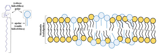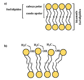 ![]() Figura 3. Exemplo de a) uma bicamada fosfolipídica e b) de modificação estrutural na presença de etanol 50,52