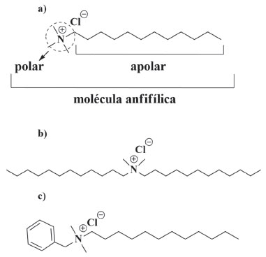 ![]() Figura 5. Exemplos de surfactantes catiônicos. Cloreto de (a) dodeciltrimetilamônio, (b) didodecildimetilamônio e (c) dodecilbenzildimetilamônio