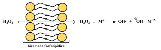![]() Figura 7. Representação da entrada do peróxido de hidrogênio através da membrana e posterior formação do radical OH