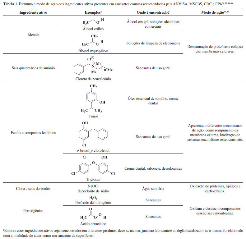 I. Departamento de Ensino, Instituto Federal de Educação, Ciência e Tecnologia da Bahia - Campus Juazeiro, 48918-900 Juazeiro - BA, Brasil Recebido em 14/05/2020 *e-mail: marialair@ifba.edu.br In December 2019, the first case of severe acute respiratory syndrome (COVID-19), caused by the new coronavirus (SARS-CoV-2) was reported and the disease was declared as a worldwide pandemic in March 2020. As there is no vaccine currently available, the daily hygiene cleaning habits and social distance are the ways to fight COVID-19 indicated by the WHO. Hand and surface hygiene has become essential and the use of 60-90% ethanol is recommended for its effective biocide action. Phenol-based products are effective sanitizers, but they can cause irritation and are not recommended for surfaces that come into contact with food. There are quaternary ammonium salts that present low toxic and are good sanitizers, as they can cause the denaturation of proteins and disruption of viral lipid bilayer. Sodium hypochlorite is one of the most used sanitizers due to its low cost and effective oxidative capacity. In the same direction, peroxides are also used as a biocide, as they cause oxidation of lipids and denaturation of viral proteins. The goal of this paper is to describe the action modes and chemical concepts of the sanitizers recommended by the ANVISA-Brazil to be used against the new coronavirus. INTRODUÇÃO Embora o mundo tenha sofrido com diversas pandemias de origens bacterianas (como a cólera e a peste bulbônica) e virais (como a gripe espanhola, a varíola e a recente H1N1) e que essas tenham causado milhões de mortes em todo o planeta,1-4 é a Coronavirus disease 2019 (COVID-19), uma enfermidade causada por um agente da família dos coronavírus, o Severe Acute Respiratory Syndrome Coronavirus 2 (Coronavírus da Síndrome Respiratória Aguda 2), mais conhecido como SARS-CoV-2 ou novo coronavírus, que se apresenta como a grande protagonista da contemporaneidade.5,6 Segundo dados da Sociedade Brasileira de Infectologia, essa doença tem se destacado devido a apresentar uma elevada taxa de contaminação (considerando um curto intervalo de tempo) aliada a um agravamento significativo no número de quadros clínicos das pessoas infectadas (com especial atenção às pessoas maiores de 60 anos e às que apresentam comorbidades).7 Isso se comprova pelo número crescente de casos, diariamente atualizado pela Organização Mundial de Saúde (OMS). Desde que foi reportado o primeiro caso, em dezembro de 2019, até o dia 11 de maio de 2020, a COVID-19 já foi detectada em todos os continentes, com um total de 4.006.257 de casos e 278.892 óbitos confirmados em apenas 5 meses.8 No Brasil, até essa data, foram notificados 162.699 casos e 11.123 óbitos ocasionados pelo SARS-CoV-2 em todas as regiões do país.9 Esse número, aliado a um grande número de subnotificações, esconde o cenário real no país e leva a um ambiente de incertezas sobre o número exato de pessoas infectadas.10 Ainda, vale ressaltar que pressões político-econômicas têm dificultado a adoção de medidas de saúde públicas e contribuído para a dimuição da taxa de adesão da população às medidas de isolamento e distanciamento social, constantemente ratificadas pela OMS.11 Isso ocorre porque, embora comprovadamente eficientes no controle da doença,12 essas medidas têm impactado, de modo bastante significativo, diferentes setores da economia, afetando a oferta e a procura mundial de produtos e materiais nas mais diversas linhas de produção e consumo e também as fontes de rendas formais e informais da população como um todo.13,14 Embora impactante, esse protagonismo do isolamento como principal medida de contenção se dá porque a disseminação da COVID-19 ocorre de modo bastante semelhante ao de uma gripe comum: ao falar, tossir ou espirrar, uma pessoa infectada (sintomática ou não)15 pode expelir gotículas contendo o vírus ativo, que podem vir a contaminar objetos e superfícies. Assim, outras pessoas podem se infectar, por exemplo, inalando essas gotículas ou tocando superfícies contaminadas. Nesse último, a infecção poderá ocorrer se, em seguida, a pessoa levar as mãos aos olhos, boca ou nariz.16 É importante ressaltar que, a depender da superfície onde se encontra, o SARS-CoV-2 pode se manter ativo por diferentes períodos: até 2,5 horas em poeira, 4 horas sobre o cobre, 24 horas sobre o papelão e até 72 horas (3 dias), sobre materiais como plástico e aço inoxidável. No entanto, estudos realizados com um vírus similar, o SARS-CoV (Severe Acute Respiratory Syndrome Coronavirus, anterior ao SARS‑CoV-2 e responsável pela pandemia de SARS em 2002-2003), também avaliaram essas superfícies e outras adicionais, como o vidro e a madeira, onde o mesmo se mostrou ativo por até 5 dias em temperatura ambiente.17,18 São essas características de transmissão, associadas a um agravamento rápido no estado de saúde dos pacientes, que têm contribuído para que sistemas de saúde de muitos países e regiões tenham entrado em colapso, com muitos pacientes em estado grave a serem assistidos simultaneamente, associados à uma pouca demanda técnico-operacional para atendê-los.13,14 Por se tratar de uma síndrome respiratória aguda, a infecção causada pelo SARS-CoV-2 afeta todo o sistema respiratório e pode causar um extenso lesionamento dos pulmões, em especial dos alvéolos (onde ocorrem as trocas gasosas), e o paciente pode vir a ter tosse e dispnéia, que é comumente relatada como um sintoma de agravamento.19 Contudo, os danos causados pelos SARS-CoV-2 não se restringem ao sistema respiratório. Evidências apontam que ele pode atacar outros órgãos e tecidos, como o coração, vasos sanguíneos, intestino, olhos, rins, fígado e cérebro.20 Embora existam muitos estudos em andamento, ainda não há nenhum antiviral específico recomendado pela OMS para o tratamento de COVID-19. No entan