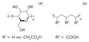 ![]() Figura 1. Estruturas da carboximetil celulose (a) e do carbopol (b)