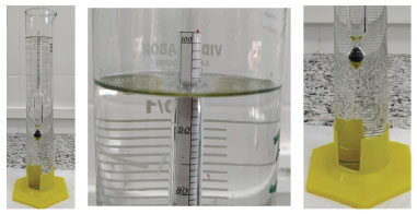 ![]() Figura 2. Verificação do teor alcoólico em etanol 96 % (v/v) utilizando alcoômetro de vidro. O ponto de leitura é na parte inferior do menisco