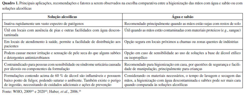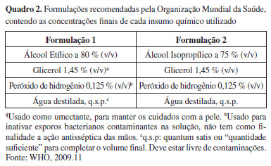 Os desinfetantes alcoólicos são mais viáveis em locais onde a população não tem fácil acesso à água descontaminada e sabão, como ruas, mercados, locais de trabalho, estações de trens e ônibus ou outros espaços de grande circulação populacional. Programas de higienização das mãos são comprovadamente eficientes para diminuir a rápida propagação de infecções do trato respiratório em profissionais da linha de frente de cuidados com a saúde. Uma pesquisa realizada com 200 profissionais dos Estados Unidos e 150 do Canadá, apontou os principais impedimentos para manter um bom programa de higienização em centros de saúde e hospitais, tendo como base principalmente a utilização de higienizadores a base de álcoois. Segundo este estudo, as principais barreiras que dificultaram a higienização das mãos foram a localização inadequada dos frascos dispensadores, o acúmulo de pessoas para utilização do mesmo frasco, locais com dispensador vazio e o uso de produtos inadequados para a integridade da pele (sensação de pele seca). No entanto, aproximadamente 50% dos respondentes afirmaram que seriam mais propensos a manter melhores condições de higiene se os frascos estivessem em ambientes mais próximos onde se encontram os pacientes.14 Preparações alcoólicas para higienização das mãos (PAHM) A utilização de preparações alcoólicas para higienização das mãos é antiga e guarda algumas incertezas em relação a real história dos responsáveis pelas invenções, tendo publicações e patentes relacionadas ao assunto, como também empresas requerendo a exclusividade de explorar a inovação.15,16 A eficácia destes produtos vai depender principalmente do tipo de álcool utilizado, da concentração, do volume aplicado e o tempo de contato.11,12,17 Em 2009, a Organização Mundial da Saúde publicou um guia extensivo, revisado em abril de 2010, contendo recomendações técnicas a serem adotadas, principalmente em serviços de cuidados com a saúde.11 O guia contém dados científicos relacionados ao tema, informações técnicas de suporte, modelos de transmissão de patógenos, além das principais barreiras e estratégias para a implementação de programas de higienização das mãos. No documento, dentre várias preparações que podem ser utilizadas, a OMS recomenda duas formulações alcoólicas de simples preparação e fácil uso, sendo uma a base de etanol 80% (v/v) e a outra de isopropanol 75% (v/v), conforme apresentado no Quadro 2.