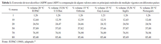 Determinação do teor alcoólico com base na formulação de etanol 80 % (v/v) da OMS As preparações alcoólicas para higienização das mãos podem apresentar o teor de álcool variando entre 60 a 95% a depender do tipo de insumo utilizado e da unidade de medida em que a concentração final é reportada.11 O teor final do princípio ativo pode ser informado em fração de volume, álcool por volume (ABV - alcohol by volume) ou conteúdo em massa, álcool por massa (ABW - alcohol by weight) que é equivalente ao ºINPM, expressão usada somente em território brasileiro, conforme normatizado pelo Instituto Nacional de Pesos e Medidas.27,32 Em um breve contexto histórico, o embasamento para a determinação do teor alcoólico de misturas de álcool e água foi proposto entre os séculos XVII e XVIII, principalmente na Inglaterra, devido ao intenso comércio de bebidas. O governo britânico propôs taxas mais rígidas para diferentes bebidas com base no teor de etanol. Foi necessário aprimorar o sistema de medição, visto que até então os valores eram grosseiramente avaliados a partir da queima direta das bebidas em combinação com materiais explosivos. Ao final da queima da mistura, caso fosse observada uma pequena explosão, a bebida era classificada como "acima da prova" (over proof, relacionado a um teor alcoólico mais elevado), caso fosse observado o contrário, ausência de explosão no final da queima, a bebida era classificada como "abaixo da prova" (under proof).33-35 A partir das contribuições de Robert Boyle, John Clarke, Bartholomew Sikes, da Royal Society e outros pesquisadores, foi desenvolvido o hidrômetro de precisão. Ao longo do desenvolvimento, foram realizados vários testes para determinar a densidade relativa aparente de misturas de etanol e água, tendo como referência a temperatura de 60 °F (15,56 °C). A partir das diferenças existentes nas densidades relativas do etanol e água puros, era possível determinar a densidade relativa das misturas e estabelecer uma relação direta para chegar ao teor etílico das bebidas.34 Na França, em 1824, Joseph Louis Gay-Lussac deu sua contribuição com o aprimoramento do alcoômetro centesimal volumétrico, no qual o zero representava a água sem álcool e o máximo da escala somente álcool puro. Suas medições foram realizadas a 15 °C (59 °F) e, neste caso, um resultado de 80 ºGL, correspondia a presença de 80 frações em volume de etanol a cada 100 frações em volume da mistura total, a 15 °C.33,35 Em ambos os sistemas inglês ou francês ainda vigentes, bem como nos demais que surgiram em outros países, as medidas realizadas em frações de volume (ABV), devem passar pela correção do teor alcoólico em função da temperatura, com auxílio de tabelas de conversão, visto que a densidade de um líquido varia significativamente com a temperatura. Devido à existência de vários sistemas, a partir de 1966 a Seção de Industrias de Fermentação da União Internacional de Química Pura e Aplicada (IUPAC), propôs a adoção de uma forma padronizada de modo que as medições pudessem ser comparadas a 20 °C. Entre os vários métodos oficiais de medida, foram todos inicialmente desenvolvidos, à época, sob regulações e padrões vigentes em cada um dos países, como por exemplo, os diferentes padrões de temperatura adotados. O documento da IUPAC traz menção sobre a dificuldade em se realizar a purificação do etanol absoluto visando obter um valor exato para a concentração alvo de 100 % de etanol, livre de quaisquer impurezas que pudessem causar desvios nas medidas. Além disso, foi mencionado as diferentes abordagens em relação ao uso dos termos densidade e densidade relativa (na época denominada gravidade específica).36 Tais diferenças contribuem para as pequenas variações encontradas na Tabela para os métodos realizados à mesma temperatura. Na Tabela 1 são apresentadas algumas conversões do teor alcoólico de massa ponderal (% massa) para porcentagem em volume utilizando diferentes métodos oficiais de medição.36,37 Os valores de teor alcoólico em massa independem da temperatura.