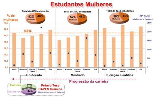 ![]() Figura 1. Representação feminina dentre os diferentes níveis de titulação (IC, mestrado e doutorado) e por região brasileira. Os dados estão mostrados como porcentagem de mulheres (eixo à esquerda, gráfico de barras) e números totais de homens e mulheres (eixo à direta, símbolo quadrado) de discentes. Os bolsistas de IC foram obtidos da base de dados do CNPq com bolsa em andamento em 2018.9 Para alunos de mestrado e doutorado, os dados foram obtidos da Plataforma Sucupira da CAPES, considerando os discentes titulados e em andamento em 2017.10 A porcentagem de mulheres que receberam Prêmio CAPES de tese na área de Química também estão apresentados, sendo considerados dados do site da CAPES no período de 2006 à 2018, tanto prêmio quanto menções honrosas