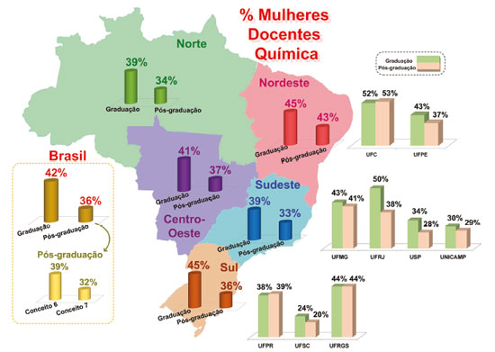 ![]() Figura 2. Porcentagem de mulheres docentes, das universidades federais e estaduais, nos cursos de química na graduação e pós-graduação, por região brasileira. Os números de algumas universidades destacadas entre os melhores cursos de graduação e pós-graduação também estão apresentados. Fonte: Para os docentes da graduação de universidades federais, foi utilizado o Portal da Transparência do Governo Federal referente a 2019.12 Para as universidades estaduais foi analisada a grade de docentes encontrada no site da instituição referente a 2019. Para os docentes da pós-graduação foi utilizada a plataforma Sucupira considerando a área de Química 2018