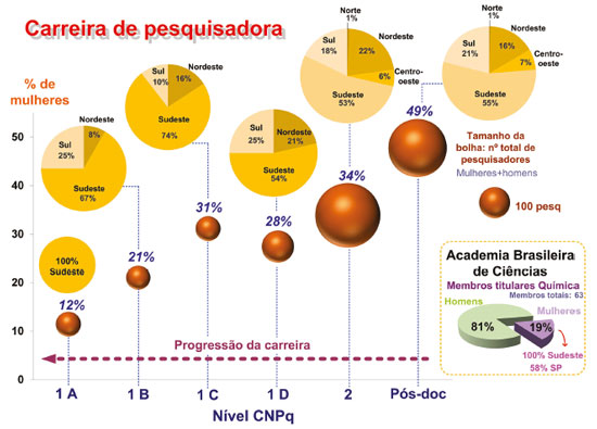 ![]() Figura 3. Distribuição de gênero na progressão da carreira científica de uma pesquisadora desde o nível Pós-Doc, bolsista produtividade do CNPq (níveis 1A, 1B, 1C, 1D e 2) até a titularidade na ABC, por região brasileira. Dados apresentados como porcentagem de mulheres e o tamanho da bolha corresponde ao número total de pesquisadores (mulheres e homens). Fonte: Os dados referentes às bolsas produtividade foram obtidos no site do CNPq (ano base 2018)7 enquanto que os dados de pesquisadores Pós-doc foram obtidos na plataforma sucupira (ano base 2019).10 Em relação aos membros titulares da ABC, os dados foram obtidos em seu site oficial em 06/201914