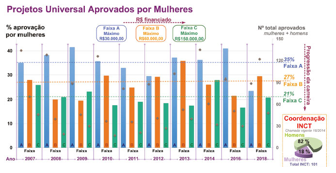 Foi analisado individualmente cada nível de bolsista produtividade, considerando como variável a região, como pode ser visto na Figura 3 no gráfico de pizza. Em todos os níveis tem-se uma maior porcentagem de pesquisadoras mulheres na região Sudeste. No nível 2, tem-se 53% no Sudeste, seguido de 22% no Nordeste, seguido do Sul, Centro-Oeste e Norte. No nível 1D não se tem representantes na região do Norte e Centro-Oeste, tendo uma distribuição de 54, 25 e 21% para Sudeste, Sul e Nordeste, respectivamente. Um comportamento similar é observado para nível 1B. No nível 1C, tem-se 74% no Sudeste, 16% no Nordeste e 10% no Sul. Por fim, no nível 1A, todas as pesquisadoras estão concentradas no Sudeste. Mesmo assim, isso representa poucas mulheres, correspondendo a 7 mulheres num total de 41 pesquisadores da região Sudeste. Outra análise interessante é que os 8% das mulheres no nível 1B na região Nordeste, corresponde a apenas 1 mulher. Na região Norte, as bolsistas nível 2 correspondem a um total de 0,7% condizendo a apenas 1 pesquisadora num total de 140 pesquisadoras mulheres no país. Outro fator que deve ser observado é a relação entre a representatividade feminina de pesquisadoras Pós-Doc e pesquisadoras com bolsa de produtividade CNPq. Verifica-se que existe uma discrepância de aproximadamente 14% entre as mulheres inseridas como bolsa de Pós-Doc e o primeiro nível da carreira de pesquisador do CNPq (Nível 2). Este número é significativo, visto que para ambos os níveis a quantidade total de pesquisadores (mulheres + homens) é praticamente equivalente (Pós-Doc número total de 371 pesquisadores e Nível 2 do CNPq total de 413 pesquisadores). Para os demais níveis do CNPq a diferença é ainda maior ao comparar o elevado número de mulheres Pós-Doc (181 mulheres x 190 homens) e os níveis: 1A (7 mulheres x 54 homens), 1B (12 mulheres x 45 homens), 1C (19 mulheres x 42 homens), 1D (28 mulheres x 74 homens) e 2 (140 mulheres x 273 homens). Esse quadro é alarmante, considerando que o período de Pós-Doc se trata de um estágio como pesquisador sem vínculo empregatício, e só apenas nos outros níveis é que o profissional está inserido formalmente no mercado de trabalho. Sabe-se que uma das maiores honrarias da carreira de pesquisador brasileiro é ser nomeado como membro da ABC e, dessa forma, é imprescindível considerar o cenário de representatividade de gênero nesta instituição. Quando analisados os membros titulares desta academia (Figura 3), é verificada na área de Química a presença de apenas 19% de mulheres. Esse valor equivale a apenas 12 mulheres de um total de 63 membros. Além disso, cronologicamente, a primeira mulher nomeada membro titular foi em 1977, 60 anos depois da fundação da ABC (em 1916). Observando os dados por região verifica-se que todas as 12 pesquisadoras estão concentradas na região Sudeste e 58% delas estão no estado de São Paulo, indicando a necessidade de maior representatividade regional e feminina.14 Uma correlação interessante é que, ainda que a região Sudeste tenha em números absolutos, maior quantidade de discentes de doutorado, tem uma das menores representações femininas nessa classe. Analogamente, as mulheres docentes na graduação na região Sudeste estão entre os menores índices do país e tem menor porcentagem de docentes mulheres na pós-graduação no Brasil, próximo a 33%. Ou seja, tem-se um número pequeno de pesquisadoras no Sudeste, mas que conseguem alcançar posições de maior prestígio na carreira (i.e., membro da ABC, bolsistas produtividade). Essa disparidade de gênero por região é igualmente preocupante porque dita padrões de referências e lideranças femininas que poderá por um lado inspirar ou por outro, desestimular futuras gerações. Juntamente com a preocupação em promover a paridade de gênero, devem-se concentrar esforços para que isso seja feito nas diversas regiões, principalmente num país como o Brasil, de dimensões continentais. De fato, essa análise por região é complexa pois também se sabe que muitas posições de liderança e reconhecimento científico no Brasil concentram-se na região Sudeste (homens + mulheres). Por outro lado, isso também é reflexo de anos de investimento público por fundações estaduais de fomento à pesquisa (e.g. FAPESP). O sucesso da carreira de uma cientista também depende fortemente dos seus projetos de pesquisa aprovados. Nesse sentido, o CNPq tem sido um órgão de fomento brasileiro fundamental e um dos seus editais mais tradicionais é o Universal. Durante anos, tem-se aberto editais para essa chamada que apresenta três modalidades de acordo com a faixa máxima de financiamento, no qual a faixa A vai até R$30.000,00, faixa B até R$60.000,00 e faixa C até R$150.000,00. Em geral, o perfil que se observa é que a faixa A é voltada para jovens pesquisadores, enquanto a faixa B para cientistas num ponto mais intermediário da carreira. Já a faixa C é para cientistas mais no topo na carreira, geralmente envolvendo pesquisadores bolsista produtividade do CNPq (nível 1A a 1C). Na Figura 4 é representada a liderança feminina em Projetos Universais (2007 a 2018). Ao longo dos anos, é possível verificar que em média a quantidade de projetos aprovados por mulheres é pequena, mas é maior na faixa A (35%), seguido da faixa B (27%) e da faixa C (21%). A faixa A apresenta o maior número de projetos aprovados, seguida da B e C. Contudo, é evidente a discrepância entre o número de mulheres e homens favorecidos em cada faixa. Para todas as faixas e para todos os anos, a porcentagem de mulheres que alcançam um financiamento para projeto pelo Universal não se aproxima da equiparação, independente da faixa. E considerando que não há, ao decorrer dos anos, uma mudança neste perfil para um progresso em relação ao maior percentual de mulheres prestigiadas, torna-se uma situação alarmante. Isso é e