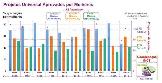 ![]() Figura 4. Liderança feminina em na aprovação de projetos Universal do CNPq na área de Química entre 2007-2018 nas faixas A, B e C. A representação feminina na coordenação de INCTs está mostrada, referente ao último edital aprovado (2014), que está vigente em 10/2019. Fonte: Os dados dos projetos aprovados (Universal e INCTs) foram obtidos nos resultados dos editais, disponíveis no site do CNPq