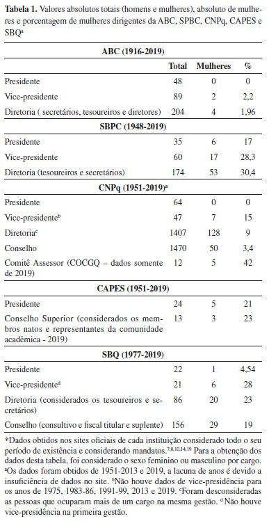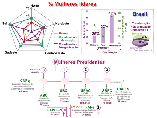 Quando comparados os números de coordenadoras com porcentagem das docentes credenciadas nesses programas, algumas correlações são interessantes. Vale ressaltar que o número total de docentes é maior que o número total de coordenadores, portanto a porcentagem em alguns casos é mais significativa que em outros. A região Sul possui 36% de mulheres docentes credenciadas nas PPGs (Figura 2), e tem 50% dos cargos de coordenador ocupados. Em contraste, na região Norte o número de mulheres credenciadas é bastante similar (34%, Figura 2), entretanto, não verificamos sua representatividade no cargo de coordenação (0%). Além disso, outros dois extremos são observados na região Sudeste e Norte. Apesar de a região Sudeste ser a segunda mais representada por mulheres na coordenação de PPG, apresentando um valor de 30% (7 coordenadoras de 23 cursos de PPG), quando se trata de docentes credenciados, essa região decai para a região menos representada com docentes mulheres (33%). O inverso ocorre com a região Nordeste, que possui maior quantidade de mulheres credenciadas em PPG (42%), entretanto, quando se trata de número da coordenação é a região com menor número de mulheres (23%). Nos PPGs de maior prestígio com conceito CAPES 6 e 7, os quais representam um total de 16 programas, a média de incidência de mulheres coordenadoras é de 37%. Isso mostra a tendência da baixa representatividade de mulheres nos programas mais conceituados. Outro papel de liderança analisado foi a reitoria, que não se restringe apenas à área da Química, mas que igualmente tem uma importância na discussão de lideranças científicas. Analisando um total de 91 reitores, apenas 26% são mulheres, um número pouco expressivo considerando a importância do cargo. A região Centro-Oeste é a que possui maior número de mulheres no cargo de reitoras (42,8%), seguida da região Sudeste (38%), Nordeste (32%), Norte (16%) e Sul, com 11% de mulheres reitoras, o menor número dentre as regiões. A Figura 5 também ilustra a representatividade feminina em posições de liderança em sociedades científicas e órgãos de fomento. Vale ressaltar que no Brasil o desenvolvimento da pesquisa científica foi fortemente amparado pela criação dessas agências. Um breve relato histórico de algumas das instituições chaves no progresso científico brasileiro, obtidos através das informações fornecidas nas páginas oficiais de cada uma delas, mostra que o início se dá com a ABC, que existe desde 1916, tendo 103 anos de atuação.14 Ser membro titular da ABC pode ser considerado o topo da carreira de qualquer cientista no Brasil e é uma das posições de maior prestígio. Em 1948, foi criada a Sociedade Brasileira para o Progresso da Ciência (SBPC), que foi estratégica e fundamental na consolidação da soberania brasileira na ciência mundial.10 Em 1951, foram criadas pelo Governo Federal duas organizações que têm sua importância destacada até os dias de hoje, e que foram fundamentais para que o país pudesse se desenvolver cientificamente. São elas: CNPq e a CAPES. O CNPq foi criado com o objetivo de promover o desenvolvimento científico e tecnológico no Brasil, além da formação de recursos humanos para esse fim. Sendo assim, possui a finalidade de examinar, avaliar e selecionar os pedidos de projetos de pesquisa de todo o país.7 Já a CAPES, tem um papel mais vinculado à avaliação do sistema nacional da pós-graduação e dessa forma fortalecendo e garantindo sua qualidade. Além disso, atua fomentando a formação inicial e continuada de professores para a educação básica.8 Outra sociedade de relevância para a área da química nacional foi a Sociedade Brasileira de Química (SBQ), fundada em 1977, no papel de uma organização em oposição ao regime militar e fortalecimento da química no país.19 Além dessas sociedades e agências apontadas, outras são citadas na Figura 5 como a União Internacional da Química Pura e Aplicada (IUPAC), e as FAPs.16,19 A IUPAC foi criada em 1919, é a mais importante organização científica a nível mundial na área da química. Ela possui a competência em relação à nomenclatura dos elementos e moléculas, bem como padronização de métodos de medida e simbologia, entre outras. Já as FAPs atuam mais localmente no amparo à pesquisa, são fundações estaduais. Quando se observam os dados referentes a essas sociedades científicas, apresentados na Figura 5, nota-se o baixo número de mulheres em relação ao número de homens que alcançam o cargo de presidência. Isto também é observado para a IUPAC e as FAPs. Esses dados foram obtidos ao analisar as informações disponíveis nos sites oficiais dessas sociedades e agências em todo o seu período de existência, e foi considerada a quantidade de mulheres presidentas neste período sem considerar a quantidade de vezes que repetiram o cargo. Para a ABC, a primeira das sociedades científicas brasileiras, percebemos que nos seus 103 anos de existência nenhuma mulher foi eleita presidenta da entidade. Foi somente em 1991 que uma mulher assumiu um cargo de diretoria, Johanna Döbereiner, como primeira-secretária. O mesmo se repete com o CNPq, que em 68 anos de existência não teve nenhuma mulher presidenta. A SBQ ao longo dos 42 anos teve uma mulher presidenta e a IUPAC teve duas mulheres, ao longo dos 100 anos. Já considerando as 26 FAPs analisadas, em 2019 apenas duas tem mulheres como diretora/presidenta. A SBPC durante os 71 anos, teve 3 mulheres presidentas, mas como algumas repetiram seu mandato, totalizaram, portanto, 6 mandatos. Por fim, a CAPES com 68 anos também teve apenas 3 mulheres presidentas, em 5 mandatos diferentes. Já na Tabela 1 são apresentadas informações sobre os cargos de presidência e vice-presidência, considerando as repetições da pessoa por cargo (mandatos), e dados das composições dos conselhos e diretorias dessas sociedades. Assim, é possív
