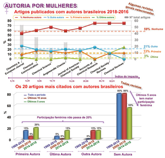 ![]() Figura 6. Representatividade das mulheres como primeira autora, última autora ou coautora em artigos publicados em algumas revistas internacionais gerais de química com índice de impacto (em 2019) e que continham vínculo com o Brasil no período de 2016-2018. No segundo gráfico, está descrita a representatividade feminina para os 20 artigos mais citados, com autoras brasileiras, considerando os últimos 10 e 5 anos e o período total. Fonte: Os dados foram coletados no site do Web of Science, em 05/2019