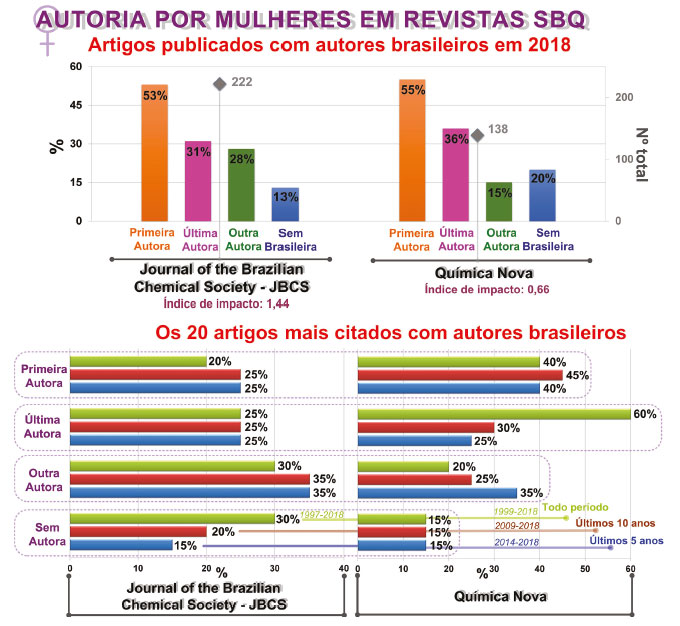 Analisou-se também a porcentagem de mulheres como última autora dos artigos, sendo considerado uma posição de destaque em uma publicação, pois geralmente refere-se a quem submeteu o artigo e supervisou maior parte daquele trabalho. Observa-se que na média de todas as revistas, somente 3% dos últimos autores são mulheres (apenas 5 artigos dos 171 totais). Esse número não varia significativamente dentre as revistas de diferentes índices de impacto, exceto para "Chemical Society Reviews" e "Chemical Reviews" que possuem alto índice de impacto, em que a porcentagem de mulher como última autora aumenta, mas como o número de artigos é baixo (3 artigos de 16 totais), esse aumento pode não ser tão representativo. Outra posição de autoria de destaque num artigo é como primeira autora, pois reflete em geral quem escreveu o artigo. Nesse caso, a porcentagem também foi muito baixa de apenas 13% (22 artigos) para todas as revistas e não teve variação dependente do índice do impacto, aparentemente. Por fim, observa-se que se tem 21% dos artigos com autoria feminina em outras posições, ou seja, que não são nem a última ou primeira autora. Ou seja, mais mulheres em posições de "menor" destaque numa publicação científica. Ainda, considerando as revistas com maior número de artigos, "Chemistry - A European Journal" e "Chemical Communication" que representam 52% (89 artigos) de todas as publicações analisadas, observa-se uma baixa porcentagem de mulheres como última autora (2%) e primeira autora (12%). Possuem também alto índice de autoria sem mulheres brasileiras (56%). Ainda avaliando a Figura 6, observam-se os 20 artigos mais citados com alguma autoria durante vários períodos visto que quanto um artigo é citado também é uma forma de analisar o prestígio de um pesquisador. Nessa categoria, o dado mais alarmante está relacionado ao percentual de artigos sem autoria feminina. Considerando todo o período (1969-2018) e também os últimos 10 anos (2009-2018), ambos apresentam uma porcentagem alta que representa a maioria dos artigos selecionados (80%) sem qualquer autora mulher. Contudo, observa-se que há uma mudança significativa nos últimos 5 anos (2014-2018) quando comparado aos períodos anteriores, em que houve uma queda de 80% para 55%, indicando que o número de citações contendo participação feminina vem aumentando ao longo dos últimos anos. Considerando os artigos que contêm mulheres como primeira autora dentre os 20 artigos mais citados (Figura 6), verifica-se um aumento expressivo na participação feminina nos últimos 5 anos quando comparado com os últimos 10 anos. Como observado no gráfico, essa porcentagem quadruplicou indo de 5% para 20% nas publicações examinadas. Porém, quando comparado este cenário dos últimos 5 anos com todo o período, esse aumento ainda é muito sutil, indo de 15% para 20%. Esses dados mostram que houve uma queda brusca de crescimento no intervalo de 2009-2018. Essa tendência oscilante entre os períodos também é observada para a porcentagem de artigos que contém mulheres como últimas autoras. Verifica-se que houve um aumento significativo nos últimos cinco anos comparativamente a todo período analisado e nos últimos 10 anos, variando de 5% e 0%, respectivamente, para 15%. Essa é uma análise importante, que mostra um aumento relevante na representatividade feminina na posição de maior destaque em autoria de artigo, visto que em geral a última autora é a pesquisadora com maior relevância científica. Apesar desses números indicarem um aumento na participação das mulheres na autoria desses artigos, esses valores ainda são inferiores a 20%. Para obter um parâmetro nacional das distribuições de mulheres em artigos publicados, foram analisadas as duas principais revistas brasileiras de Química: Journal of the Brazilian Chemical Society (JBCS) e Química Nova (QN) (Figura 7). Verificou-se o número de mulheres atuando como primeira, última e coautora para todos os artigos publicados com autores brasileiros (ano 2018) como também os 20 artigos mais citados nessas revistas em diferentes períodos.