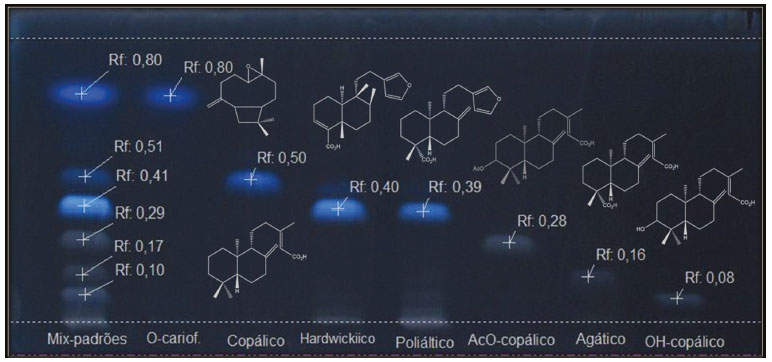 RESULTADOS E DISCUSSÃO A busca pela caracterização e controle de qualidade dos óleos de copaíba empregando técnicas mais simples, rápidas e baratas que aquelas publicadas recentemente visou eliminar os maiores impeditivos da maioria das técnicas: analisar a oleoresina sem precisar de derivatização e mesmo na ausência dos biomarcadores para comparação, em especial dos diterpenos. De posse desses padrões, resultado das investigações e isolamentos realizados com os óleos de copaíba pelo grupo de pesquisas, procedeu-se o estudo de diversos sistemas por HPTLC. Para otimizar as análises dos biomarcadores da copaíba, foram pesquisadas diferentes condições de saturação e ativação das placas cromatográficas, de inserção das amostras e de composição de fase móvel. Encontradas as condições ótimas, os Rf dos biomarcadores tendo sido obtidos, buscou-se entre dezenas de substâncias mais facilmente acessíveis comercialmente, o padrão de comparação mais eficiente, que eluisse em região diferente dos biomarcadores, evitando sobreposições (resultados não apresentados). Com o padrão definido para relacionar seu Rf aos dos biomarcadores terpênicos, procedeu-se os estudos analíticos de repetição e variação das concentrações. Caracterização química dos biomarcadores da oleoresina de copaíba por HPTLC Os ácidos copálico (250 µg mL-1), hidróxi-copálico, (100 µg mL‑1), acetóxi-copálico (100 µg mL-1), agático (100 µg mL-1), hardwickiico (100 µg mL-1), poliáltico (250 µg mL-1) e o óxido de cariofileno (100 µg mL-1) foram analisados individualmente por HPTLC nas diferentes concentrações, volume de aplicação, sistemas de eluição e revelação para a caracterização de seus fatores de retenção (Rf), otimizando as condições de eluição que permitissem sua separação com resolução superior a 2,0. Diversos sistemas eluentes foram testados, solventes simples, misturas binárias e ternárias, assim como vários sistemas de visualização. Obtidas as condições ótimas, todos os padrões foram reunidos, formando o que foi chamado de mistura de padrões. Somente os ácidos hardwickiico (Rf = 0,40) e poliáltico (Rf = 0,39) apresentaram Rf's muito próximos, inviabilizando a caracterização adequada por HPTLC desses biomarcadores reunidos. A composição da fase móvel que apresentou a melhor separação dos biomarcadores foi constituída por hexano:acetato de etila 7:3, com volume de aplicação de 10 µL de cada padrão. A melhor visualização das manchas foi alcançada com a revelação em etanol sulfúrico a 10%, seguido de aquecimento por 5 minutos e visualização na luz ultravioleta com comprimento de onda 366 nm (Figura 1).