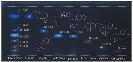 ![]() Figura 1. Perfil cromatográfico dos principais biomarcadores terpênicos detectados em óleos de copaíba (Copaifera sp) por HPTLC
