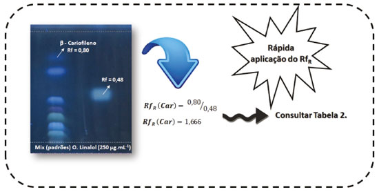Os valores de RfR apresentados na Tabela 1 foram desenvolvidos a partir das curvas analíticas dos biomarcadores terpênicos em função da concentração do óxido de linalol. No desenvolvimento das curvas analíticas, observou-se um leve aumento nos valores de Rf's obtidos para o óxido de linalol com o aumento da sua concentração. Foi observado que quanto maior a sua concentração, maior foi sua interação com a fase estacionária, contribuindo para o espalhamento da banda, e consequentemente para o aumento da distância central da mancha. Como o RfR consiste na razão entre o Rf do biomarcador terpênico pelo Rf do óxido de linalol [RfR = (Rfbiomarcador/RfO. Linalol)], à medida que a concentração do óxido de linalol aumenta, o RfR do biomarcador terpênico irá diminuir. Aplicação do método A metodologia desenvolvida para caracterização dos biomarcadores terpênicos por meio do fator de retenção relativo (RfR) foi aplicada a três espécimes de óleos de Copaifera multijuga. Os óleos de copaíba (1 mg mL-1) e o óxido de linalol (100 µg mL-1) foram aplicados (10 µL) nas placas de HPTLC sob as mesmas condições cromatográficas. O β-cariofileno [RfR = (0,78/0,47 = 1,659)], o óxido de cariofileno [RfR = (0,68/0,47 = 1,447)], o ácido copálico [RfR = (0,41/0,47 = 0,872)] e o acetoxi-copálico [RfR = (0,25/0,47 = 0,532)] foram caracterizados satisfatoriamente pelo fator de retenção relativo (Figura 3). Os resultados obtidos para os valores de RfR de cada biomarcador nas oleoresinas foram comparados com os limites de predição a 95% de confiança, disponíveis na tabela 1, a 100 µg mL-1 do óxido de linalol. A principal característica dos óleos de C. multijuga é a presença majoritária do β-cariofileno (Rf = 0,78) entre os sesquiterpeno, e do ácido copálico (Rf = 0,41), entre os diterpenos. Além do β-cariofileno, seu óxido (Rf = 0,68) também é relatado em concentrações variáveis nos óleos dessa espécie.17