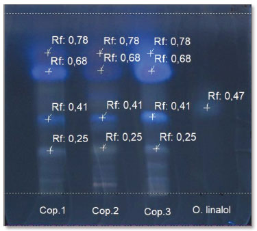 ![]() Figura 3. Caracterização química do β-cariofileno (Rf = 0,78), óxido de cariofileno (Rf = 0,68), ácido copálico (Rf = 0,41) e acetoxi-copálico (Rf = 0,25) nos óleos de C. multijuga, através do Fator de retenção relativo (RfR) ao óxido de linalol (100 µg mL-1)