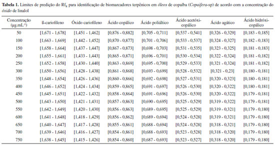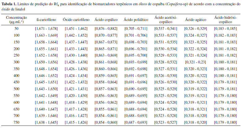 O ácido copálico é o principal diterpeno detectado nos óleos de C. multijuga. Entretanto, seus derivados, os ácidos acetóxi-copálico (Rf = 0,25) e hidróxi-copálico, são frequentemente relatados para os óleos dessa espécie.17 Os principais biomarcadores terpênicos dos óleos de C. multijuga foram caracterizados com êxito, mostrando a grande aplicação do desenvolvimento do RfR em óleos de copaíba por HPTLC. A metodologia desenvolvida mostrou-se uma excelente alternativa para a caracterização dos biomarcadores dos óleos de C. multijuga, principalmente dos ácidos diterpênicos, que são obtidos por isolamento em bancada e usualmente não estão disponíveis comercialmente. Além disso, a utilização do RfR dispensa a derivatização das oleoresinas, que é uma etapa obrigatória nas análises por cromatografia à gás e posterga a utilização de técnicas dispendiosas como a HPLC, possibilitando a rápida caracterização dos biomarcadores. Não obstante, o RfR pode ser aplicado às demais oleoresinas do gênero Copaifera para caracterização de seus biomarcadores terpênicos. CONCLUSÃO O desenvolvimento da metodologia empregando o fator de retenção relativo (RfR) por HPTLC é descrito pela primeira vez para caracterização de biomarcadores em óleos de copaíba. A metodologia empregando o (RfR) ao óxido de linalol mostrou-se uma excelente estratégia, de aplicação prática e útil no cotidiano do químico de produtos naturais, por se tratar de um padrão comercial de fácil acesso e baixo custo. A metodologia proporciona identificações rápidas e confiáveis (CV< 2%), sem a necessidade do isolamento, possibilitando a caracterização dos constituintes químicos e diferenciação entre os diversos óleos de copaíba.