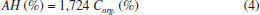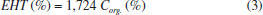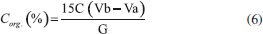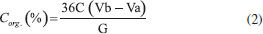 Para amostras líquidas, recomenda-se que a concentração máxima na alíquota analisada seja de 500 mg L-1 de AF + AH. As análises foram realizadas em triplicata para cada produto. Alíquotas de 5,001 a 30,455 g, determinadas a partir das informações do fabricante, foram diluídas a 1 litro com NaOH 0,1 mol L-1 em um béquer plástico. Em seguida, a suspensão foi homogeneizada por agitação magnética (Velp Scientific -AREX Magnetic Stirring). A suspensão foi centrifugada (Fanem Excelsa II-Mod 206 BL) por 10 minutos (1118 g) em tubos de centrífuga de 50 mL tipo Falcon. Os precipitados insolúveis foram separados e o sobrenadante alcalino, que contém AF e AH, foi coletado em um béquer plástico de 1 litro. A seguir, a suspensão foi acidificada até pH 1,00 ± 0,05 com HCl 4 mol L-1, sob agitação magnética monitorando-se o pH com eletrodo (Digimed DM 20). Após atingir pH 1, o frasco contendo a suspensão foi coberto com filme plástico e mantido sob agitação magnética por 1 hora. A suspensão resultante foi mantida em repouso por 12 horas para que a fração contendo AH precipitasse, separando-se a seguir o AF por decantação e centrifugação por 10 minutos (1118 g). O sobrenadante ácido contendo AF foi passado em resina amberlite DAX-8 (SUPELITETM) na forma ácida, acondicionada em coluna de vidro de 40x250 mm, usando-se uma bomba peristáltica (Masterflex Mod 7014-20). Os compostos hidrofílicos de baixo peso molecular não são adsorvidos em DAX-8 e percolam pela coluna, enquanto os AF ficam adsorvidos. A seguir foram passados 50 mL de água deionizada pela coluna para remoção de excesso de sais e de compostos orgânicos de baixo peso molecular que não tenham sido devidamente percolados. A fração de AF foi eluída com solução de NaOH 0,1 mol L-1 em volume suficiente para sua remoção total (aproximadamente 25 mL). A seguir a coluna foi lavada com 100 mL de água deionizada e depois foram passados 50 mL de HCl 0,1 mol L-1 para o seu recondicionamento e uso da próxima amostra. Por fim, a solução de AF na forma básica foi passada em resina de troca catiônica Amberlite IR120 na forma ácida, para remover os cátions contaminantes. O AH precipitado em tubo de centrífuga foi pré-pesado e secado em estufa a 60 ºC. Da mesma forma, a solução contendo AF foi seca em estufa em becker de vidro a 60 ºC. Após a secagem, as amostras foram resfriadas em dessecador e pesadas. O teor de cinzas em cada fração foi determinado conforme descrição anterior. O teor de AH e de AF foi calculado após descontar-se respectivamente o teor de cinzas das amostras. Método "MAPA 2007" e "MAPA 2017" No método MAPA proposto em 2007 pela IN28,12 recomenda-se que, após diluição com solução de NaOH 0,1 mol L-1, a quantidade máxima de AH+AF na alíquota seja de 300 mg de carbono orgânico provável. A partir das informações fornecidas pelo fabricante, foi pesada (Mettler Toledo ME 403) com precisão de 0,1 mg uma quantidade da amostra líquida contendo até 300 mg de carbono orgânico provável. A essa alíquota foram adicionados 50 mL de NaOH 0,5 mol L-1 e a suspensão foi transferida para balão volumétrico de 500 mL, completando-se o volume com água destilada. Essa solução foi denominada de extrato húmico total (EHT). Para determinação do teor de carbono no EHT, foram transferidos 25 mL dessa solução com pipeta volumétrica para um erlenmeyer de 250-300 mL. Essa alíquota foi seca em estufa (Hotpack Mod 260030) a 90 ºC. A seguir foram adicionados 10 mL de K2Cr2O7 0,20 mol L-1 e, em seguida 20 mL de H2SO4 concentrado, agitando-se suavemente a suspensão. O erlenmeyer foi coberto com vidro de relógio e deixado em repouso por 30 minutos, para esfriar. A seguir, o mesmo foi colocado sobre chapa aquecedora (Velp Scientifica AREX- Heating Magnetic Stirrer) ajustada para temperatura de 140 ºC e a solução fervida por 30 minutos. Terminado o tempo de reação, o erlenmeyer foi retirado da chapa e deixado esfriar, sob o vidro de relógio. Após lavagem do vidro de relógio para o erlenmeyer, foram adicionados aproximadamente 100 mL de água destilada, 10 mL de H3PO4 (85% p.a.) e a solução foi deixada esfriar. Em seguida, foi acrescentado 0,5-1 mL da solução indicadora de difenilamina e a solução foi titulada com solução de sulfato ferroso amoniacal 0,5 mol L-1 (SFA). Foram conduzidas, simultaneamente, pelo menos duas provas em branco, omitindo-se a presença do extrato-amostra. A solução de SFA foi padronizada com solução K2Cr2O7 0,2 mol L-1, a qual foi preparada após secagem do reagente a 105 ºC. A padronização da solução de SFA é feita imediatamente anterior à sua utilização. O teor de carbono orgânico (m/m) é dado pela equação (2): ![]() sendo: Corg.(%) = carbono orgânico; C = concentração da solução de SFA padronizada; Va = volume da solução de SFA gasto na titulação da amostra (mL); Vb = volume da solução de SFA gasto na titulação da prova em branco (mL); G = massa inicial da amostra (g). O cálculo de teor de carbono orgânico é efetuado com base na premissa de que cada mol de K2Cr2O7 consumido reagiu com 1,5 mol de carbono orgânico. O teor de EHT (%) é dado pela equação (3): ![]() A separação do AH foi realizada em 50 mL da solução do EHT acrescentando-se H2SO4 a 20% (v/v) sob agitação manual lenta até atingir-se pH 1. Após repouso de aproximadamente 18 horas, a suspensão foi centrifugada por 20 minutos (1118 g) e o AH (precipitado) separado do AF (sobrenadante). O AH foi ressolubilizado com volume suficiente de NaOH 0,5 mol L-1 e a solução básica transferida para um balão volumétrico de 50 mL, cujo volume foi completado com água destilada. Essa solução resultante foi denominada solução de AH. Para determinação da concentração de AH, 25 mL da solução de AH foi transferida para um erlenmeyer de 250-300 mL, e evaporados em estufa a 85-90 ºC (Hotpack Mod 260030). O teor de AH foi determinad