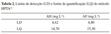 Caracterização dos produtos A determinação da concentração de sólidos suspensos nas amostras foi realizada gravimetricamente, empregando-se três replicatas coletadas do frasco do fertilizante imediatamente após vigorosa agitação manual. Uma amostra entre 10 a 20 g do produto líquido foi pesada (precisão 0,001 g) (Metler Toledo ME 403) em frasco pré-pesado e colocada para secagem a 60 ºC (Hotpack Model 260030) até massa constante. Testes preliminares (dados não mostrados) indicaram que nessa amplitude de massa era possível obter valores mensuráveis e confiáveis de massa seca para os cinco produtos. Após secagem, o sistema foi pesado novamente e a concentração de sólidos em suspensão (CS) foi então calculada pela equação (1), ![]() em que: Mf = massa do fertilizante após secagem (g); M0= massa inicial amostra líquida (g). Para remoção da água, foram utilizados dois métodos: liofilização (VLP 200, Thermo-Savant Micro Modulyo) e secagem em estufa a 60 ºC. No método de secagem por elevação de temperatura, realizada em estufa (Hotpack Model 260030) a 60 ºC, a amostra seca foi colocada em dessecador para esfriar e em seguida foi pesada. A temperatura não deve ultrapassar 60 ºC para que não ocorra a perda de substâncias proveniente da decomposição de componentes orgânicos e volatilização de compostos de interesse. Na liofilização, a massa da amostra seca é determinada por diferença entre o peso da amostra líquida e o da amostra seca após a sublimação. A partir dos valores obtidos nesses ensaios e baseando-se nas informações sobre teores de AH e AF indicadas no rótulo dos produtos comerciais, foi definida a massa inicial a ser utilizada na determinação de SH. A determinação prévia dessa massa é necessária para que os valores de SH permaneçam dentro do limite de detecção de cada método, fornecido na literatura. O teor de cinzas foi determinado segundo HPTA.11 Amostras liofilizadas foram pesadas (Metler Toledo ME 403) em cadinhos pré-pesados e levados à mufla (Quimis) durante 4 horas na temperatura de 500 ºC. A seguir, os mesmos foram removidos da mufla e colocados em dessecador para resfriar. Os cadinhos com as cinzas foram pesados à temperatura ambiente (≈ 25 ºC) e o teor de cinzas foi calculado gravimetricamente. A composição elementar foi determinada em amostras liofilizadas, moídas previamente em gral de ágata, em analisador elementar (Perkin Elmer CHN/S modelo 2400). A partir dos resultados desta análise, a razão C/N foi calculada. Quantificação das SH Método HPTA O método estabelecido pela HPTA11 ( Humic Products Trade Association) dos Estados Unidos da América (EUA) é o adotado pela Sociedade Internacional de Substâncias Húmicas (IHSS). O Limite de Detecção (LD) e o Limite de Quantificação (LQ) desse método são apresentados na Tabela 2.