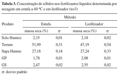 RESULTADOS E DISCUSSÃO Concentração de sólidos suspensos A concentração de sólidos suspensos nos fertilizantes líquidos variou de 1,78% a 52% (Tabela 3) e, com exceção do produto Terram, o método de secagem não afetou o resultado. Para o fertilizante Terram, a concentração de sólidos foi de 51,99% para a amostra seca em estufa e de 47,19% para a amostra liofilizada (Tabela 3). Possivelmente a temperatura de 60 ºC não foi suficiente para eliminar toda a água de hidratação das fibras de SH, levando a um valor maior do que aquele obtido no processo de liofilização. De fato, a amostra seca a 60 ºC apresentou superfície selada no recipiente (dado não mostrado), o que pode ter levado à contenção da água de hidratação nas fibras.