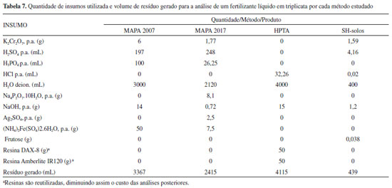 De acordo com CONAMA, Resolução nº 430, de 13 de maio de 2011,19 a concentração máxima permitida lançada em cursos d'água é 0,1 mg L-1 de cromo hexavalente e 1,0 mg L-1 de cromo trivalente. A concentração de cromo trivalente no resíduo do método MAPA 2007 é 630 mg L-1, no resíduo de MAPA 2017 é 265 mg L-1 e no resíduo de SH-solo é 1450 mg L-1. Portanto, esses resíduos devem ser devidamente tratados para seu descarte apropriado e isso gera um custo adicional ao método. O uso de H2SO4 p.a. é associado à utilização do K2Cr2O7. Os métodos MAPA 2017 (248 mL) e MAPA 2007 (197 mL) são os que mais utilizam esse reagente, enquanto o volume utilizado pelo SH-solos é da ordem de 4 mL (Tabela 7) Dos métodos estudados, o método HPTA é o que gera maior quantidade de resíduos (Tabela 7), porém, é o de menor impacto ambiental, pois utiliza como reagentes NaOH e HCl, que geram NaCl e H2O O método MAPA 2007 gerou um volume de 3367 mL de resíduo e o MAPA 2017 gerou um volume de 2415 mL de resíduo (Tabela 7).