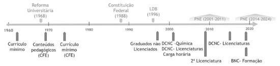 ![]() Figura 1. Linha do tempo com as principais regulamentações referentes às Licenciaturas em Química no Brasil. Na parte superior são apresentadas as regulamentações referentes ao ensino superior de forma geral, na parte inferior as que versam sobre os cursos de Licenciatura em Química. Nota: CFE - Conselho Federal de Educação; LDB - Lei de Diretrizes e Bases da Educação Nacional; DCNC - Diretrizes Nacionais Curriculares para os Cursos de Química; DCNC-Licenciaturas - Diretrizes Curriculares Nacionais para a Formação de Professores da Educação Básica em nível superior; PNE - Plano Nacional de Educação; BNC-Formação - Base Nacional Comum para a Formação Inicial de Professores da Educação Básica