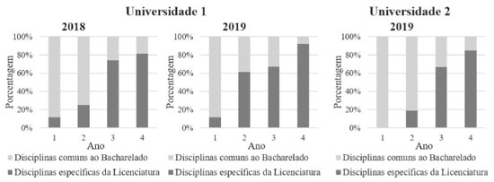 Quando analisados os números de horas dedicadas aos conteúdos / práticas pedagógicas, percebe-se que a carga horária não difere significativamente. Entretanto, em termos percentuais, nota-se que o curso da Universidade 1 dedica maior porcentagem do curso a conteúdos pedagógicos, enquanto a Universidade 2 dedica maior porcentagem de seu currículo às disciplinas / conteúdos específicos da química. A Figura 2 mostra como a distribuição da carga horária das disciplinas específicas da Licenciatura e comuns ao Bacharelado se altera ao longo do curso. Para a Universidade 1, houve alteração na matriz curricular referente aos ingressantes nos anos de 2018 e 2019 sendo apresentados os dados de ambos.