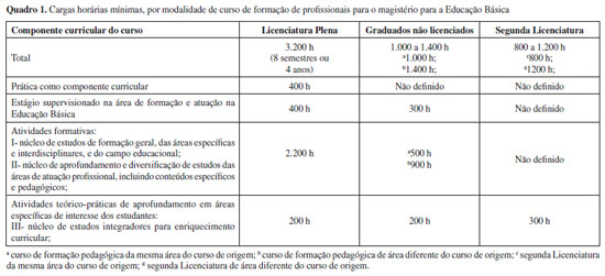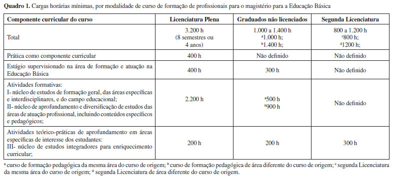 Fica evidente a importância do desenvolvimento de conteúdos específicos e pedagógicos. Porém, deve-se ressaltar a relevância de uma visão ampla de mundo ao professor, destacando-se que o profissional professor deve ser mais do que um especialista. O item VI é diferença importante desta proposta, pautando que, durante a graduação o sujeito aprenda a "ser" professor e, para tanto, além de conhecimentos "sobre" docência, é necessário o desenvolvimento de conhecimentos que só se fazem "na" e "pela" experiência, cabendo ressaltar que tal experiência só se torna significativa quando ocorre atrelada ao processo de reflexão sistemática baseada em conhecimentos e conceitos teóricos. Vale destacar a relação entre a pesquisa educacional e o estabelecido nos marcos legais em desenvolvimento. A crítica ao modelo da racionalidade técnica, exemplificado pela formação "3+1" e a compreensão das dimensões prática e crítica para a formação fazem emergir investigações e concepções relacionadas à presença de conhecimentos e saberes que necessitam ser desenvolvidos por meio da reflexão sobre a prática. Apontado por diversos autores, experiência e processo reflexivo começam a ser tratados nos marcos legais, sendo considerado que a constituição dos saberes docentes deve ser construída em um modelo que reconheça uma identidade própria para a profissão e que possibilite seu desenvolvimento no momento da prática por meio de atividades envolvendo o contato entre licenciando e escola14,15 Partindo do cenário descrito, no qual as pesquisas sobre formação de professores apresentam recorrentes debates relacionados à necessária articulação teórico-prática, a Resolução CNE/CP 02/200210 apresenta uma determinação específica a respeito da carga horária mínima dos cursos incluindo 400 horas de Prática como Componente Curricular (PCC), 400 horas de estágio curricular supervisionado, 1800 horas de aulas para os conteúdos curriculares de natureza científico-cultural e 200 horas para outras formas de atividades acadêmico-científico-culturais. Em 2015, é aprovada a Resolução CNE/CP 02/2015,16 que institui Diretrizes Curriculares Nacionais para a Formação de Professores da Educação Básica em nível superior (DCNC-Licenciaturas) que, de modo geral, conserva a essência das diretrizes anteriores, alterando a carga horária, sua distribuição e sistematizando outras duas modalidades de cursos de formação inicial para profissionais do magistério da Educação Básica criados neste interstício: (i) os cursos de formação pedagógica para graduados não licenciados, regulamentado inicialmente em caráter emergencial pela Resolução CNE/CP 2/199717 e (ii) cursos de segunda Licenciatura, regulamentado anteriormente pela Resolução CNE/CP 1/2009.18 As três modalidades diferem essencialmente quanto à carga horária e sua distribuição, como pode ser observado no Quadro 1.