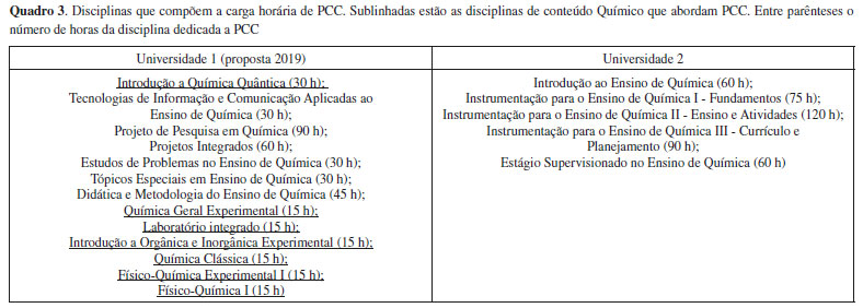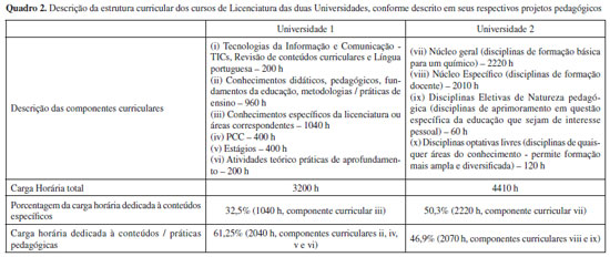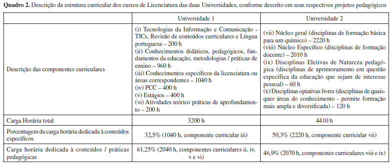 RESULTADOS E DISCUSSÃO O Quadro 2 apresenta as estruturas curriculares dos cursos de Licenciatura para as duas Universidades sendo as descrições dos componentes curriculares aquelas apresentadas em seus respectivos PP. Apresenta-se ainda uma análise da porcentagem de horas-aula dedicada às disciplinas pedagógicas (aqui incluídas disciplinas teóricas, estágios, PCC e atividades teórico-práticas de aprofundamento) e disciplinas de conteúdo específico (Química e disciplinas complementares, como Física e disciplinas das áreas de Matemática e Geociências).