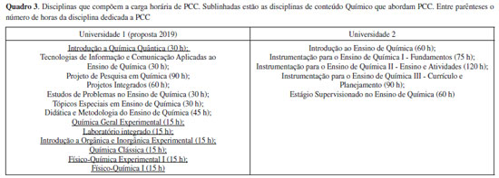 Os gráficos apontam que a Universidade 1 inclui disciplinas específicas da Licenciatura desde o primeiro ano da graduação e a carga horária dessas disciplinas aumenta gradativamente ao longo do curso, ultrapassando 90% no último ano. Observa-se que a mudança de matriz curricular ocorrida entre 2018 e 2019 prioriza ainda mais esse aspecto. Para a Universidade 2 observa-se que tais disciplinas tem seu oferecimento com início no segundo ano com porcentagem de 20% ocorrendo um incremento gradativo e atingindo pouco mais de 80% no último ano. Dessa forma, há indícios de que o caráter pedagógico da formação para a docência ocorre mais intensamente, mas não de forma exclusiva, nos anos finais do curso, após a formação técnico-científica pautada no conteúdo específico da área. O comparativo entre as matrizes curriculares permite observar que a Universidade 1 oferece, em termos porcentuais, mais disciplinas da área específicas da Licenciatura do que a Universidade 2. É necessário destacar que o conhecimento dos conteúdos específicos é essencial para a prática docente e não pode ser renegada no curso de formação de professores assim como uma série de outros conhecimentos precisam ser desenvolvidos ao longo de todo o curso. A priorização dada às disciplinas específicas da Licenciatura pode indicar, dependendo do caráter das disciplinas, uma percepção da formação da identidade do licenciando que se aproxima da Resolução CNE/CP 1/200213 e dos estudos sobre a formação inicial promovidos nas últimas décadas. No entanto, ainda que as resoluções relacionadas à necessidade da inserção de disciplinas pedagógicas ao longo de todos os anos da graduação já tenham completado mais de uma década, notam-se ainda diferentes cursos que mantêm uma estrutura pautada na formação específica da área para a posterior formação pedagógica. Kasseboehmer e Ferreira37 relatam a resistência de coordenadores de cursos de Licenciatura em Química no que se refere à distribuição da carga didática entre disciplinas pedagógicas e técnico-científicas destacando que "vários coordenadores revelaram preocupação com a carga horária destinada à preparação do futuro professor de Química para a sala de aula, o que prejudicaria a "transmissão de conteúdos químicos"(p. 698).37 Esse tipo de preocupação não se restringe aos coordenadores, sendo bastante frequente no corpo docente. A persistência de um currículo que trabalhe primeiro o conteúdo específico e posteriormente o pedagógico passa também por questões relacionadas à forma de acesso dos estudantes ao ensino superior. Alguns autores, como Maximiano38 e Dias da Silva e col.,39 defendem o ingresso comum aos cursos de Bacharelado e Licenciatura, tendo como principal argumento a imaturidade dos ingressante para realização de tal escolha, refletida nas altas taxas de desistência. Os autores apontam que mesmo com a escolha tardia pela Licenciatura seria possível desenvolver uma identidade própria aos licenciandos e que esse modelo permite aos futuros professores construírem uma base conceitual sólida. Compreendemos que um curso de Licenciatura com identidade própria, desvinculado da característica de complementação ao Bacharelado, inclui a escolha da opção profissional no ingresso à Universidade, ou mais tardar, no ano inicial do curso, permitindo que as ações formativas necessárias sejam realizadas de forma progressiva ao longo de toda a formação e possibilitando ao licenciando iniciar esse processo ainda nos primeiros semestres de curso, desenvolvendo reflexão na e sobre a prática docente culminando nas atividades de atuação nos estágios supervisionados. Nota-se que há posições diferentes em relação à estrutura dos cursos e mesmo que existam argumentos que defendem o modelo pautado na racionalidade técnica, os diferentes estudos desenvolvidos ao longo das últimas décadas têm se posicionado, de forma clara, contrários a tal proposta.14 Não obstante, por mais que a legislação deva ser alvo constante de um olhar crítico, a mesma tem acompanhado tais discussões no campo das políticas de formação. Outra questão a ser destacada refere-se ao fato de que a simples implementação de disciplinas com caráter pedagógico nos diferentes anos da graduação não garante sua articulação com as disciplinas de conteúdo específico ou com o ambiente educacional do futuro professor. Por vezes, o que pode ocorrer é um distanciamento ainda maior entre conteúdos específicos e pedagógicos, aspecto esse que pode ter pautado os objetivos pensados na proposição das horas de PCC. Se retomarmos à ideia por trás da PCC, relacionada a prática como proposta reflexiva para o desenvolvimento dos conhecimentos profissionais de professores, destacamos que, segundo Shulman,23 esses são desenvolvidos em 4 grandes esferas: (1) conteúdos específicos da área, (2) estrutura e materiais educacionais, (3) conteúdos da área educacional e (4) relação/reflexão para a prática. Para Tardiff2 os saberes docentes podem ser provenientes de 4 fontes: (1) Saberes da formação profissional, (2) Saberes disciplinares, (3) Saberes curriculares e, (4) Saberes experienciais. Nota-se que existe concordância de que os conhecimentos e saberes docentes são desenvolvidos por uma base teórica sólida, conceitual, pedagógica e da experiência. Portanto, ao traçarmos como promover articulações teoria-prática e entre conhecimentos conceituais e pedagógicos, faz-se necessário que a PCC deva ser trabalhada em disciplinas que envolvam estes diferentes domínios. Dessa forma, um ponto relevante a ser observado é como a implementação da PCC está refletida na matriz curricular de cada curso. O Quadro 3 descreve as disciplinas nas quais estão previstas horas dedicadas a PCC, conforme listado por ambas as Universidades em seus PP.