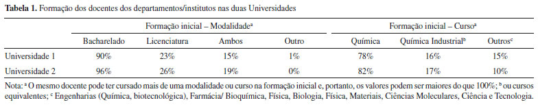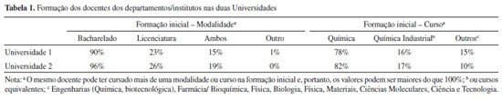 Na Tabela 1 observa-se que o perfil de formação inicial dos docentes de ambas as Universidades é muito semelhante, sendo que a maioria significativa é formada na modalidade Bacharelado e cerca de 25% tem formação em Licenciatura, sendo uma parcela formado em ambas as modalidades. Quanto ao curso, a maior parcela é formada em Química e/ou Química Industrial e os docentes formados em outros cursos apresentam formação em áreas correlatas à Química. Na Tabela 2 também é observada grande semelhança entre o perfil dos docentes de ambas as instituições no que se refere à formação em pós-graduação, sendo a grande maioria em Química, uma pequena parcela em outras áreas e apenas 1% (equivalente a 1 docente em ambos os casos) com formação específica em área de ensino de ciências/educação. Quanto à formação complementar, nota-se que cerca de 20% tem relação com a área de ensino, por meio da realização de cursos ou pela participação em programas de extensão e outras atividades. Esses dados levantam uma questão bastante relevante no que concerne a formação dos formadores, uma vez que uma parcela pequena dos docentes tem formação em Licenciatura, uma parcela menor ainda dedica-se em sua pesquisa ao ensino de Química e poucos apresentam experiência na Educação Básica, a qual seria de grande valia para a maior compreensão da realidade escolar para a qual os futuros professores que estão sendo formados. Compreende-se que, devido à estrutura de formação dos docentes, não é possível que todos tenham dedicação exclusiva à área de formação de professores, uma vez que a atuação ocorre para diferentes cursos e a formação em áreas específicas é necessária ao desenvolvimento da pesquisa. Essa é uma problemática marcante, como destaca Arroio e col.:41