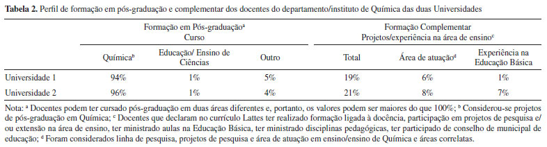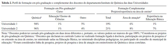 Observando o Quadro 3 é possível notar que o curso da Universidade 1 considera a distribuição da carga horária da PCC em disciplinas de Química e em disciplinas de interface inseridas ao longo de todo o currículo do curso. Cabe ressaltar que ao analisarmos a matriz curricular e, portanto, documentos oficiais que transmitem as intenções e normas, não é possível analisar como de fato a PCC está sendo desenvolvida. Questões relacionadas a como os docentes que ministram disciplinas de conteúdo específico articulam a PCC nas suas práticas, como a Universidade / coordenação tem trabalhado a questão e qual a compreensão da PCC pelo corpo docente não são possíveis de serem respondidas com base nessa análise. No PP da Universidade 2, observa-se a implementação da PCC em disciplinas de interface e nos estágios. Dessa forma, nota-se que esses dois casos refletem o que tem sido destacado na literatura no que se relaciona à implementação da PCC.19,25,28 Algumas Universidades ainda justificam a segunda estrutura com base na flexibilização do currículo, no histórico de desistência em anos iniciais dos cursos de Licenciatura (ou pedidos de transferência para o Bacharelado) e ainda pela autonomia do discente em construir seu caminho formativo38,39 O que pode-se verificar é que a construção do PP fica sujeita à especificidades relacionadas a cada curso, podendo essas estarem ligadas a diferentes fatores tais como as linhas de atuação dos docentes e as características daqueles que são responsáveis pelo desenvolvimento da proposta, fatores que podem também permear aspectos relacionados à possibilidade de execução da proposta. O que é possível afirmar referente a esses dois casos é que a implementação da PCC ainda apresenta divergência. Apesar de não ser possível estabelecer um modelo mais ou menos adequado para tal, na adoção da PCC exclusivamente dentro das disciplinas de interface há uma clara contribuição quanto à potencialidade da articulação do estudante com o ambiente e cultura escolar e temas do ensino. No entanto, não se evidencia de forma clara como os conteúdos específicos são articulados, como apontam alguns autores.32 Desse modo, nessa situação de adequação do currículo, corre-se o risco de retomar ao cenário do "paradigma perdido" descrito por Shulman,22 no qual os conteúdos específicos acabam se perdendo em relação às propostas de ensino. Assim, considera-se que a inserção de disciplinas de interface é uma proposta que promove potencialidades quanto à concepção da PCC, mas deve-se reiterar a importância do trabalho junto às disciplinas específicas, uma vez que esse pode mobilizar maiores contribuições ao processo formativo no âmbito do Conhecimento Pedagógico do Conteúdo. Destaca-se que, sendo possível a implementação de projetos que realmente articulem a PCC dentro das diferentes disciplinas, tal fato poderia contribuir para equacionar uma problemática há tempos discutida dentro dos cursos de formação, a qual se refere ao distanciamento entre a área específica e a área pedagógica. Entretanto, faz-se necessário que as intencionalidades da implementação da PCC sejam claras sendo possível compreendê-la como proposta de reestruturação e não de adequação curricular.19 Tal clareza por parte de todo o corpo docente pode fomentar debates importantes na consolidação ou refutação de tal proposta. Nesse sentido, e de modo a ampliar as discussões a respeito dos locais de desenvolvimento da PCC, investigações mais aprofundadas a respeito de como esse componente tem sido desenvolvido em disciplinas específicas e de interface em conjunto a compreensão das concepções dos docentes responsáveis podem ser fundamentais para ampliar o debate. Propostas nesse sentido têm sido reportadas mais recentemente, mostrando cenários de mobilização de uma parcela grande do corpo docente formador que atuam tanto em disciplinas específicas quanto de interface, apontando caminhos interessantes para práticas que potencializem os objetivos da PCC.28 No entanto, nota-se que, de modo geral, os docentes responsáveis por disciplinas pedagógicas têm sua formação em pedagogia ou áreas correlatas e podem não apresentar o arcabouço teórico da disciplina específica para realizar essa articulação. Em contrapartida, muitas vezes, os docentes responsáveis por disciplinas conceituais não apresentam formação pedagógica e, portanto, não estão formalmente preparados para realizar tal articulação.40 Com isso, mesmo não havendo o trabalho com a PCC dentro de disciplinas de Química, a opção da Universidade 2 pode justificar-se no sentido de que busca minimizar tal problemática, uma vez que as disciplinas de interface são ministradas por profissionais do instituto / departamento de Química que atuam com perspectivas de pesquisa na área de ensino. Dessa forma, a escolha por essa estrutura pode ser influenciada pela formação inicial e continuada dos docentes que atuam nos cursos e especificamente nas disciplinas que envolvem a PCC. Com o intuito de compreender melhor este cenário nas Universidades investigadas buscamos traçar o perfil de formação dos docentes, em nível de graduação, pós-graduação e experiência/formação complementar, dados expressos nas Tabelas 1 e 2.