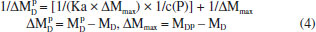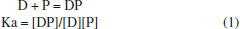 RESULTS AND DISCUSSION Theory of the estimation of binding constants by ACE method In the research of drug and protein interaction, drugs or the protein can be added into the ACE running buffer. In this experiment, considering the cost of the experiment, BSA was added to the buffer solution as an additive, and the drug concentration was used as a fixed amount. The drug and serum albumin are assumed to be a 1: 1 combination. The following equation represents the drug-serum albumin binding reaction.19,20 ![]() where [D], [P], [DP] represent the concentrations of the drug, serum albumin and drug-protein complex, respectively. Equation (2) is used to calculate Ka.21 ![]() where µDP and µD represents the electrophoretic mobility of drugs in the presence and absence of protein. Δµmax = µDP - µD , where µDP is the mobility of the complex. Linear graphs were obtained by plotting 1/ΔµDP against 1/c(P). Therefore, the binding constant can be calculated from the intercept/slope. However, the analysis method has limitations due to the protein added to the buffer. Protein adsorption onto the capillary wall can cause problems in separation and loss of protein and drug. The buffer viscosity and EOF varies as the protein concentration changes and causes a difference in Ka.22 In order to minimize this phenomenon, the mobility ratio (M) was introduced.23 M has proven to be independent of operating voltage and buffer viscosity, so it can estimate Ka more accurately. The following formula shows the calculation of M.24 ![]() where teo represents the migration time of the EOF and tDP represents the migration time of the analyte. Therefore, the Scatchard equation is corrected to the following equation (4).25 ![]() where MPD and MD represent the mobility of the drug in the presence and absence of the protein, respectively. MDP represents the mobility of the complex. In this study, Scatchard analysis is carried out with equation 4, and Ka is obtained by linear fitting. Measurement of the drug/BSA binding constant by ACE Peak time of buddleoside (tPD) and DMSO (tR) are listed in Table 1. At 298K, with the change of BSA concentration, the electrophoretograms of the complex formed by buddleoside and BSA is shown in Figure 2. From Table 1 and Figure 2, it can be seen that with the increase of BSA concentration, the peaks of buddleoside and DMSO shift to the right. Due to the complexation between buddleoside and BSA, the m/z of the complex increases and the peak time of the complex is later than the uncomplexed form. With the increase of BSA concentration, the peak pattern of the buddleoside is gradually asymmetric. At different temperatures, the Scatchard equation and Ka calculated from the intercept and slope ratios of buddleoside and BSA are shown in Table 2. The binding constant Ka decreased from 1.218 × 105 to 2.330 × 104 with the increase of temperature.