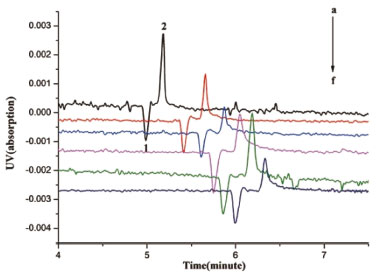 ![]() Figure 2.Electropherograms of buddleoside and BSA conjugate at different BSA concentrations in 30 mmol L-1 borate buffer (pH = 8.8, 0.05 mol L-1 Gly). Among them, a-f represents the BSA concentration of 0, 2, 4, 6, 8, and 10 µmol L-1, respectively, and the concentration of buddleoside is fixed at 100 µmol L-1. Peak1: DMSO, 2: buddleoside